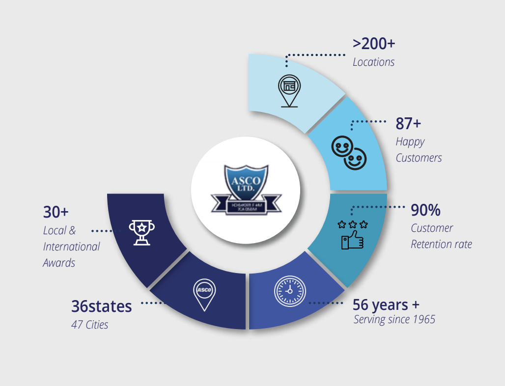We are more than a regular security company. For us at ASCO, Security Service is professionalism at its core and metric value adding. This is why the Brand and business has transcended five decades and boast of over 90% customer retention. We have become a viable dependable Security Services partner and a proud part of our client's growth over the years.